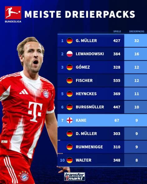在上周拜仁客场4-1击败霍芬海姆的比赛中,凯恩完成了帽子戏法,北京时间9月23日,德国转会市场列举了德甲球员在联赛中完成帽子戏法次数的排行榜,其中盖德-穆勒居首,凯恩位列第七名。