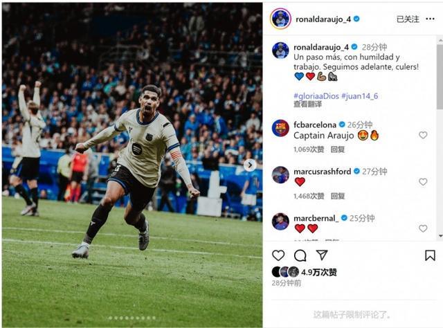 阿劳霍社媒晒照庆祝取胜,他写道:“又迈出一步,怀着谦逊与努力。我们继续前进,巴萨球迷们!”
