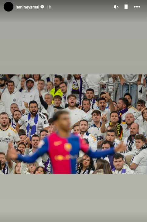 雷速体育10月26日宣 新赛季西甲首回合“国家德比”即将在北京时间今晚打响,赛前巴萨小将亚马尔在社交媒体发布了上赛季巴萨客场4-0大胜皇马之时,自己在对手球迷的怒视之下扬手庆祝的照片。