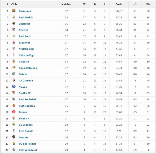 皇马在2025年比巴萨多踢了一场西甲,战绩为27胜5平6负,比巴萨少了10分。比利亚雷亚尔战绩第三,马竞第四,贝蒂斯第五。塞维利亚与皇家社会两支劲旅状态不佳,排在后半区。在打满全年比赛的17支非升班马和降级队中,赫罗纳战绩最差,只拿到31分。