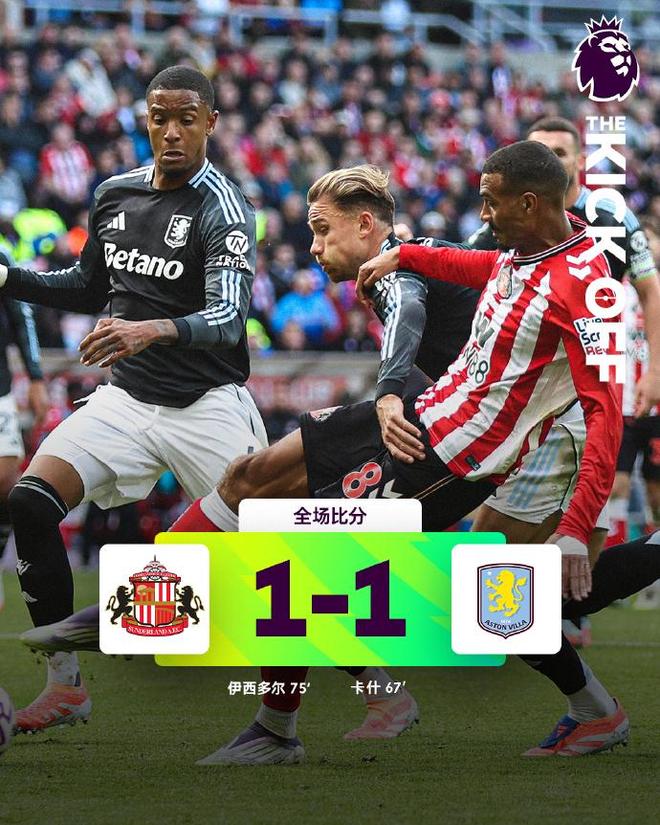 上半场第34分钟,雷尼尔多倒地状态蹬踏对手,吃到红牌被罚下,但维拉多打一人优势情况下,直到下半场第67分钟敲开了桑德兰的球门,卡什一脚世界波破门,比分1-0领先,这也是维拉新赛季英超的首个进球,但很快比分被扳平,扎卡助攻伊西多尔破门,桑德兰1-1追平,这个比分也保持到比赛结束。