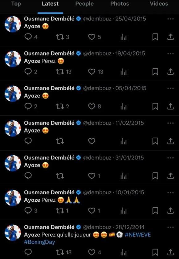 这些推文显示,现效力于比利亚雷亚尔的阿约泽-佩雷斯曾是登贝莱的偶像之一。