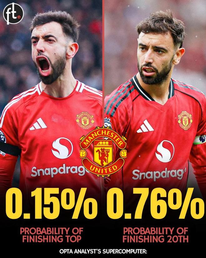而按照Opta通过超级计算机分析的数据预测,曼联本赛季最终赢得英超冠军的概率仅为0.15%,而他们排名第20位垫底的概率则为0.76%。