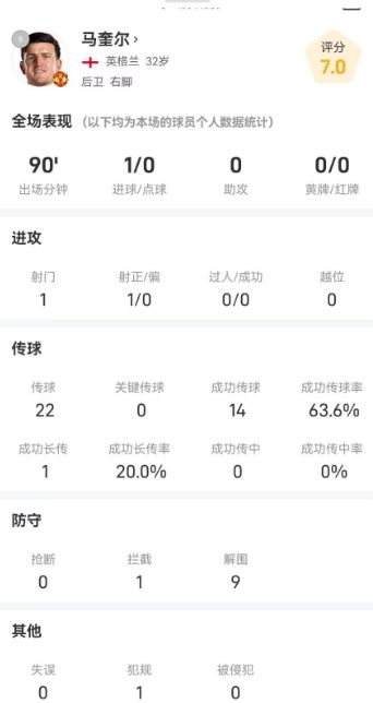 作为球队的后卫,马奎尔在进攻端闪耀的同时,没有忘记自己的本职工作。马奎尔在场上有着1次拦截和9次解围,多次化解对手的进攻,这同样显得非常难能可贵。