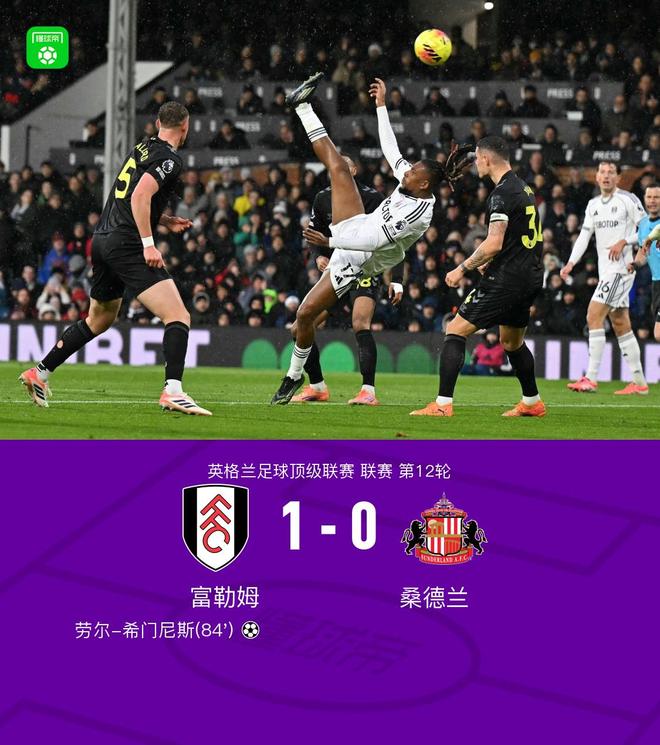 北京时间11月22日23:00,英超第12轮,富勒姆坐镇主场迎战桑德兰。上半场双方均无建树;下半场,丘库埃泽送出关键助攻,帮助劳尔-希门尼斯完成破门。凭借此次进球,富勒姆以1-0战胜对手,全取三分。