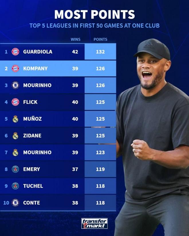 德国转会市场统计了五大联赛单一俱乐部主帅前50场联赛的积分,并列出前50场联赛拿分最多榜单,孔帕尼执教拜仁前50场联赛拿到126分,仅少于瓜迪奥拉。