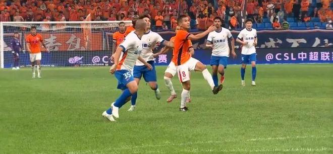第45+2分钟,刘军帅禁区支撑手手球,裁判回看VAR后,果断吹罚点球。克雷桑主罚命中,泰山队将比分扩大到2-0!