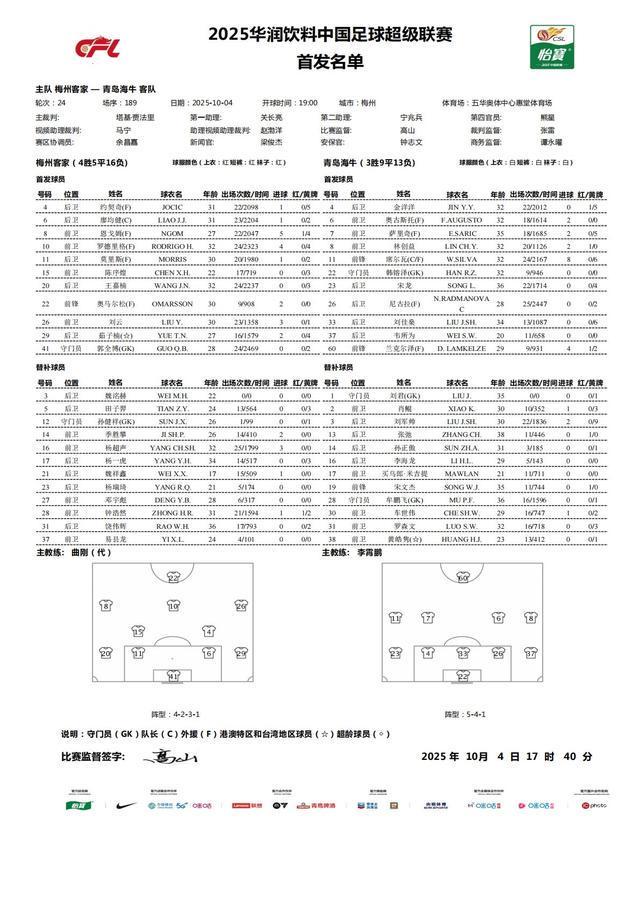北京时间10月4日19:00,中超第24轮的一场较量。梅州客家坐镇主场,迎战青岛海牛。赛前,双方的阵容公布如下: